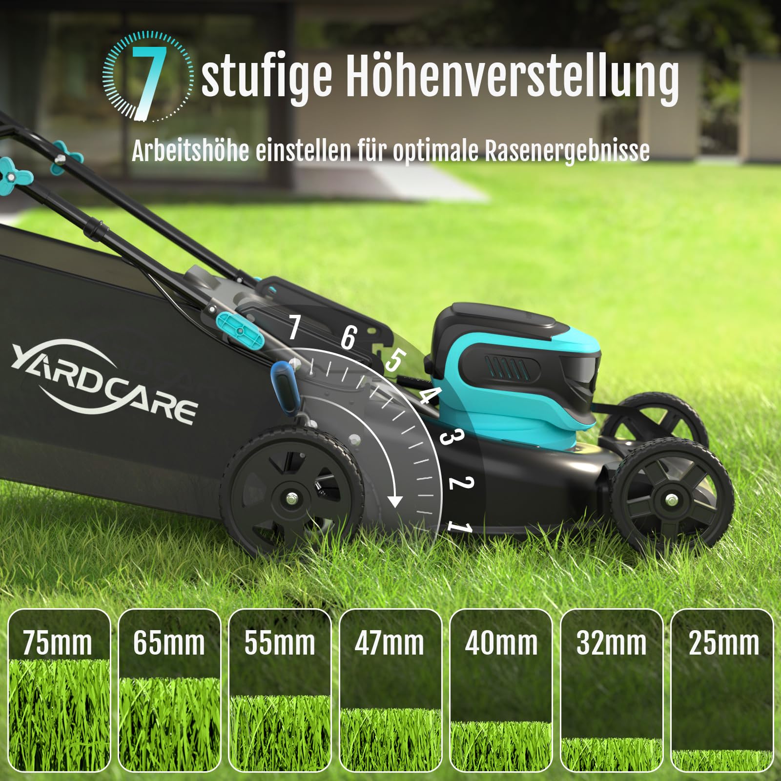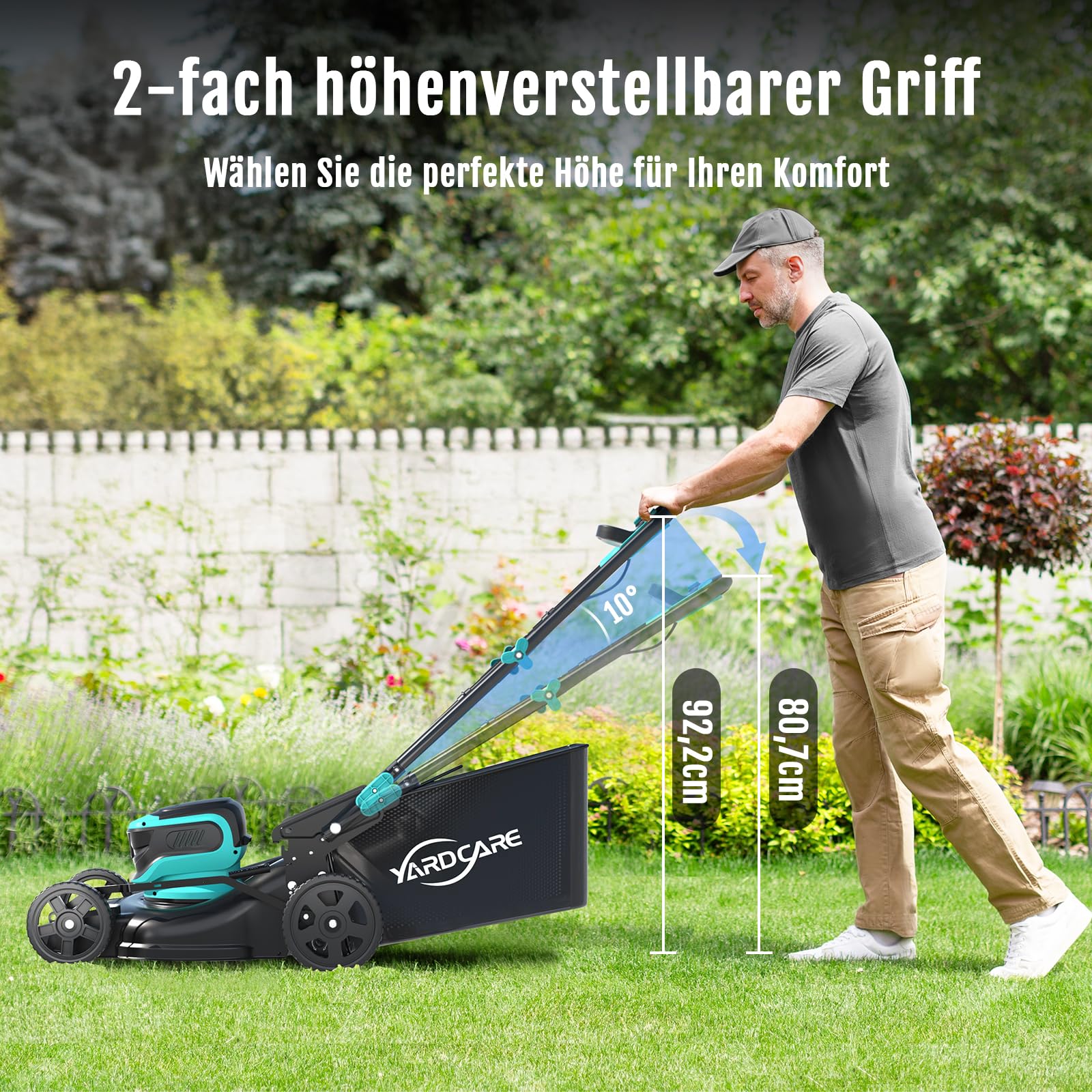 YARDCARE Akku Rasenmäher (bis 675 m², 41cm Schnittbreite, inkl. Mulchkeil&45L Fangsack, Anzeige) 36V, Brushless, 7-stufige Höheneinstellung, Höhenverstellbarer&klappbarer Griff, 2 Akkus & 2 Ladegerät