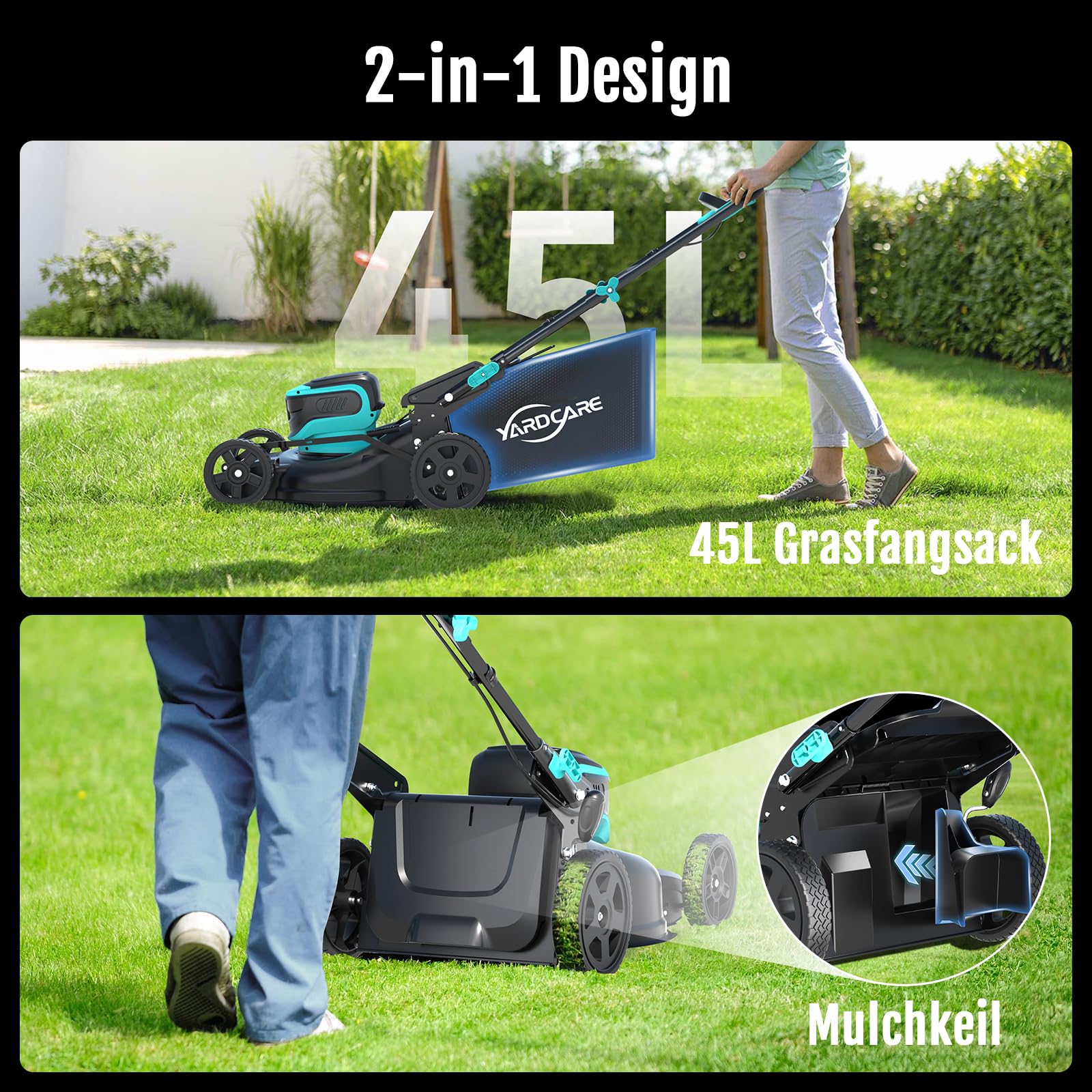 - 【2-in-1: Mähen & Mulchen】Das Graskammdesign sorgt dafür, dass selbst verwachsenes Gras effizient gekämmt und geschnitten wird. Der großzügige 45L-Fangsack reduziert die Häufigkeit des Entleerens. Außerdem ist Akku Rasenmäher mit einem Mulchkeil ausgestattet, das Grasschnitt als natürlichen Dünger für ein gesundes Grün direkt auf den Rasen verteilt. – Für einen gesunden, gepflegten grünen Rasen.