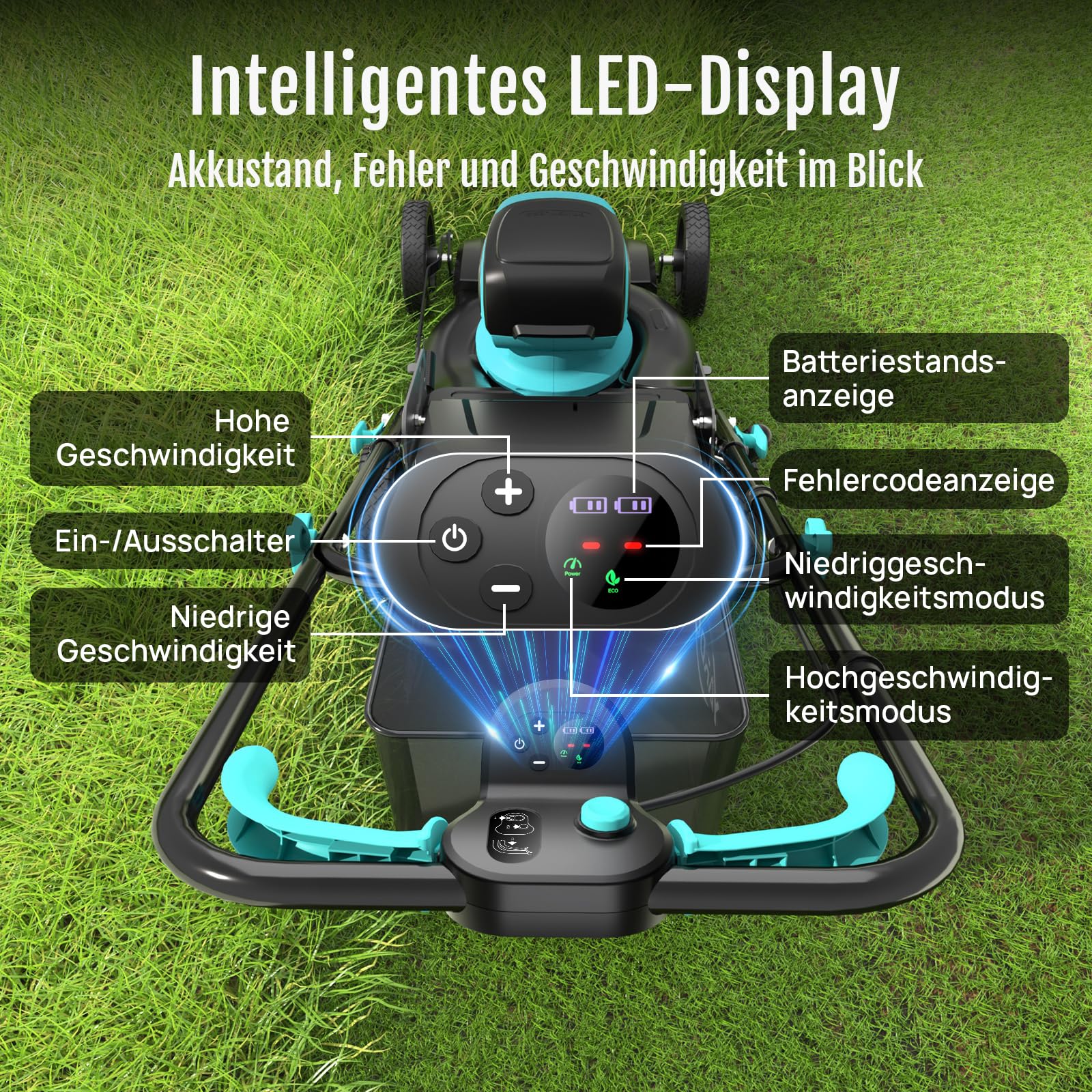- 【Digitalanzeige】Der Akku Rasenmäher ist einfach zu bedienen und verfügt über eine Digitalanzeige, die Leistung, Fehlercodes und Geschwindigkeitsmodi anzeigen kann, sodass Sie den Status des Rasenmähers jederzeit kontrollieren können. – Einfach, präzise und benutzerfreundlich.