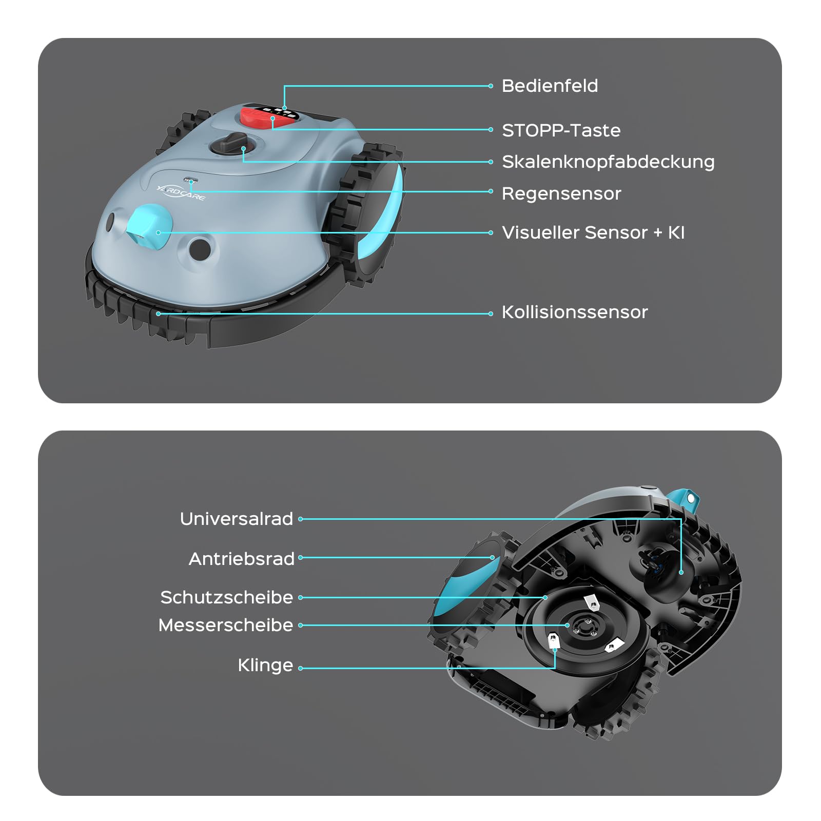 YARDCARE V100 Mähroboter ohne Begrenzungskabel, Vision-Navigation, 150 Hinderniserkennung, für bis zu 150 m², mit Graskamm & Ersatzklingen